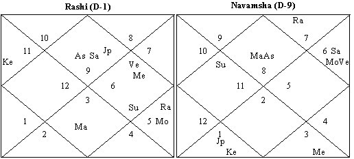 Lagna’s condition: The lagna is, as previously mentioned is also conjunct Saturn and opposed by Mars in the rasi. In the Navamsha, it is conjunct Rahu and surrounded in adjacent houses by both Mars and Saturn.